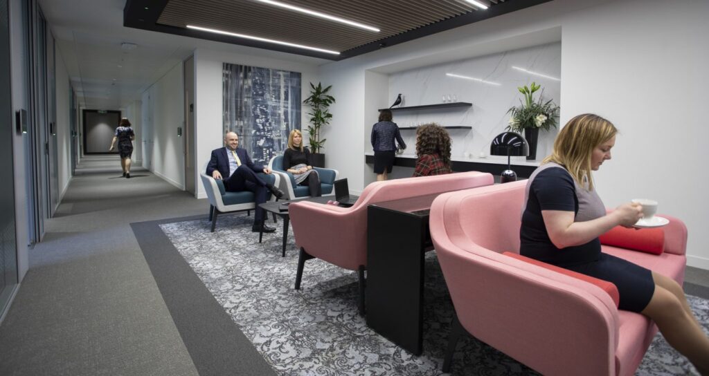 Visiting clients are well catered for with an expansive client suite comprising 22 meeting rooms, a 100-seat auditorium, a separate client lounge. The suite conveys professionalism and confidence, reflects the new brand identity and encourages visitors to work on site with independent print facilities and refreshments.