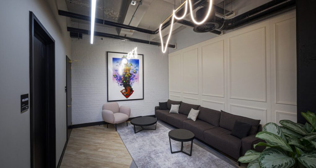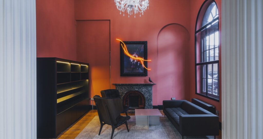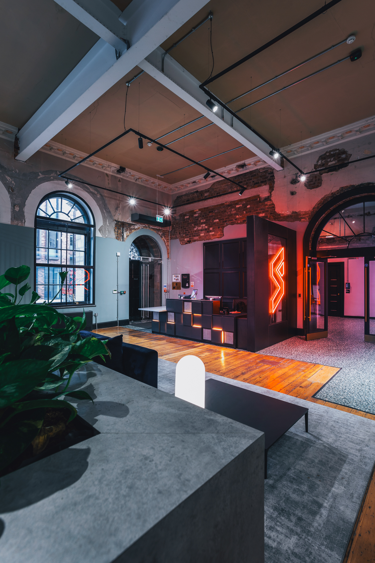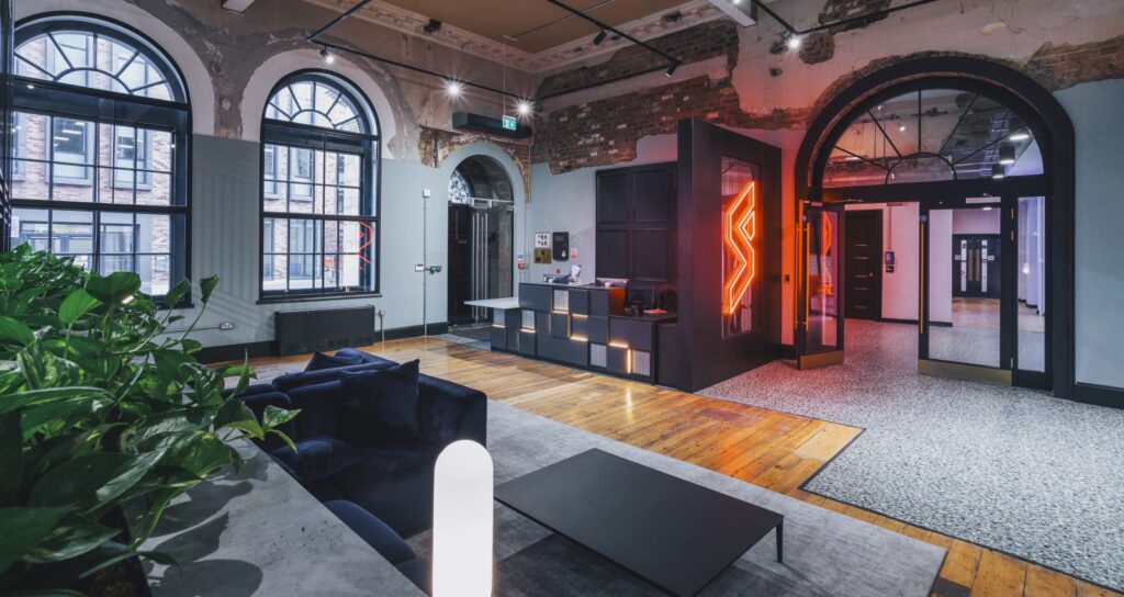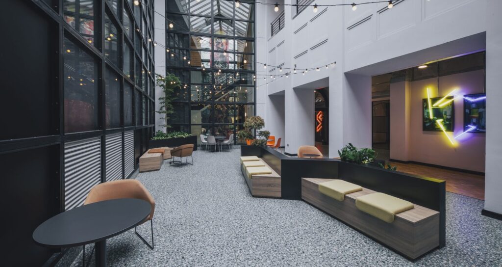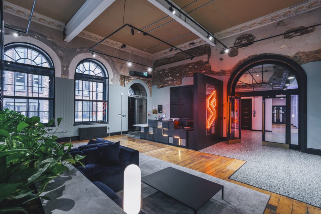 The finished design builds on the landlord’s distinct aesthetic finish of half plastered walls set against unfinished ceilings and original windows, columns and floors. Some architectural change was required to solve the building’s limitations effectively such as the Duke Street entrance which couldn’t be made wheelchair accessible, therefore the ground floor car park was repurposed to create a new accessible entrance, which leads straight into the statement town hall space and glazed atrium – complete with central tree and Firesprite logo-shaped seating.