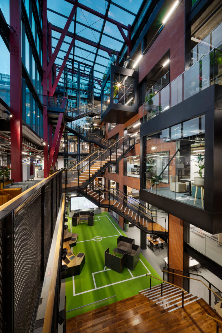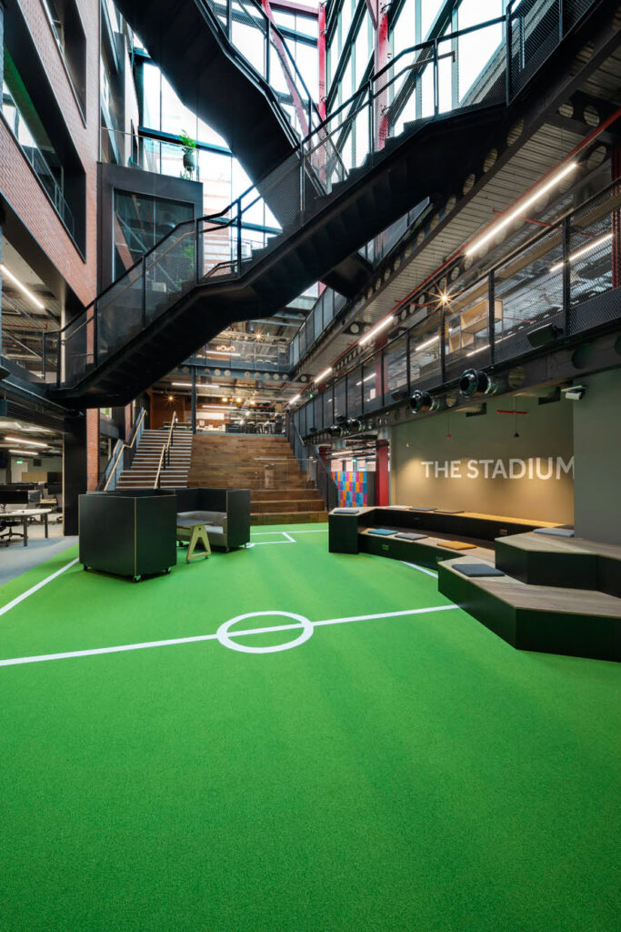 Inclusion of a football pitch, complete with football tunnel, is one of the playful touches that guarantee a ‘brand welcome’ on the ground floor. As you move through the floors, distinct themes become apparent. The first floor is a team space with a combination of formal meeting and quiet rooms. The second floor is for more technical work with a focus on studio spaces and a mock-up shop to replicate Flutter’s different retail environments, while the fourth floor is home to collaboration settings and individual touchdown spaces. The fifth floor houses a hugely modernised café complete with a relaxation and gaming area, while the sixth floor, which boasts striking views of the Wicklow Mountains, is a collaboration zone for meetings, company gatherings and social activities alike.