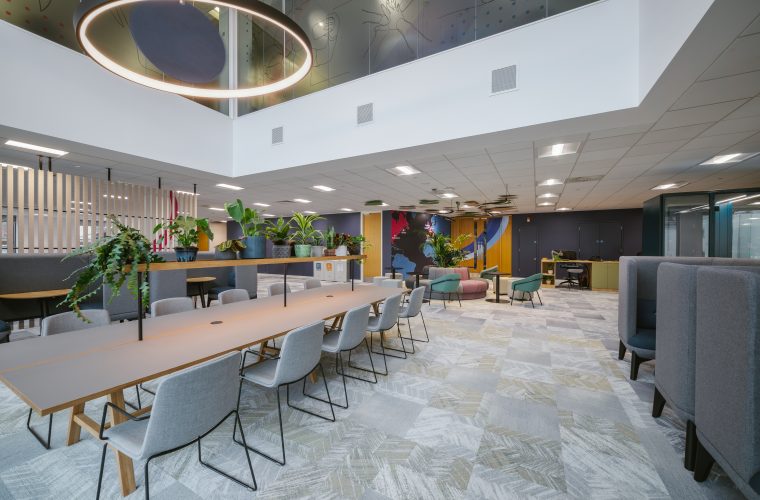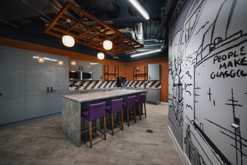 Meeting rooms are named after the statues and monuments of poets found in George Square, with each room featuring artwork that pays tribute to its namesake. Additional pieces throughout the social areas and main office incorporate iconic elements of Glasgow’s identity, creating a cohesive and locally rooted environment.