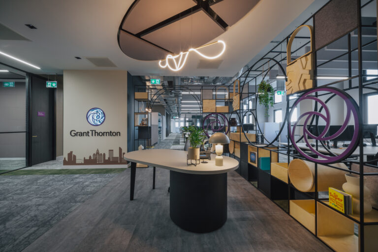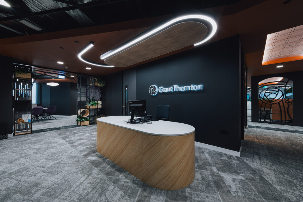 The office is a fully connected, open-plan space that begins at a welcoming reception area and flows throughout the entire floor. Archways and sliding doors offer flexible segmentation, allowing areas to be closed off when privacy is required. A multifunctional breakout space provides the perfect setting for the team to socialise and also enables Grant Thornton to host large events for both their team and clients. This area leads seamlessly to an outdoor space with stunning views of the city, enhancing the overall working experience.