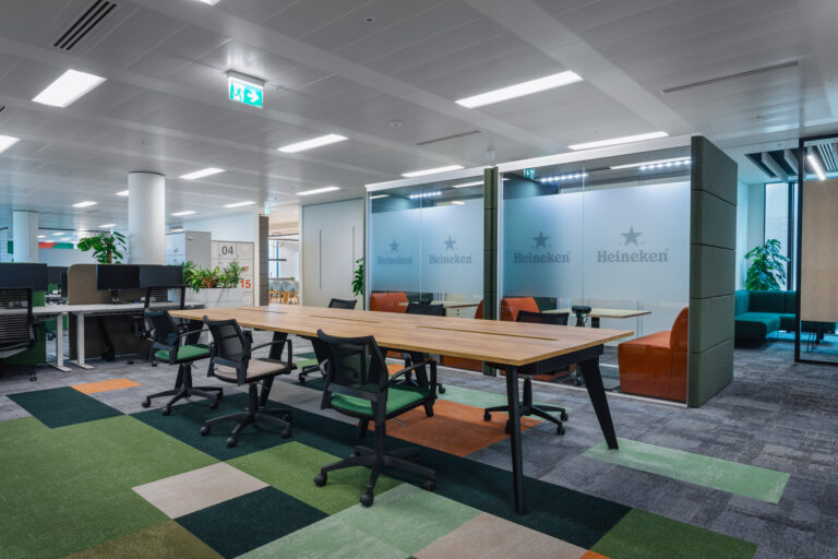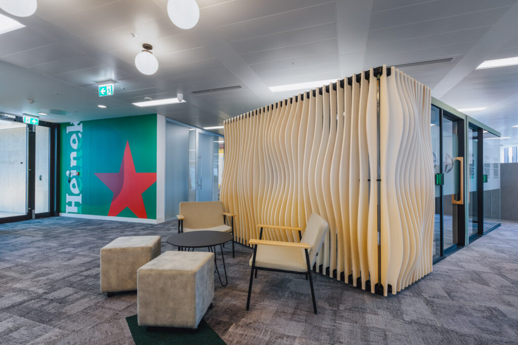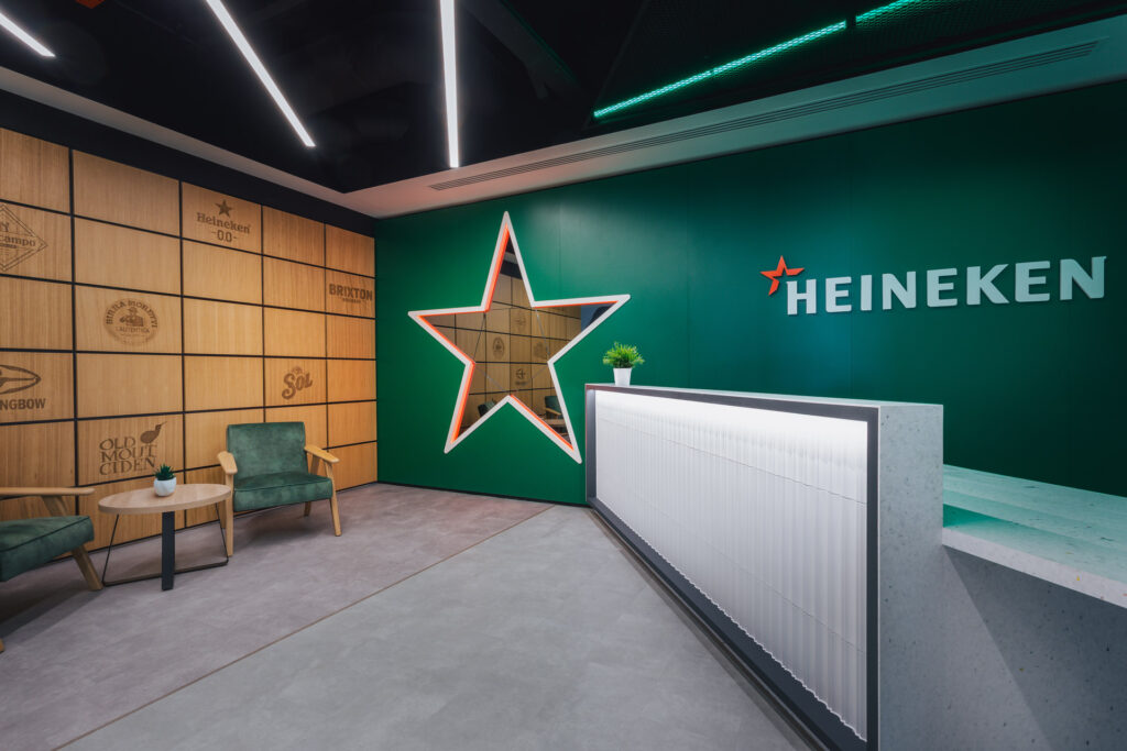 When visitors enter the office they are greeted by a reception area featuring a brand wall made of wooden panels engraved with subsidiary logos. Built with a modular click system, it allows for future additions, making it a flexible and evolving feature. Throughout the workspace, branded elements are subtly and boldly integrated, from green tones and glass accents to custom graphics and Heineken’s iconic star motif, ensuring the brand is consistently present without overwhelming the space.