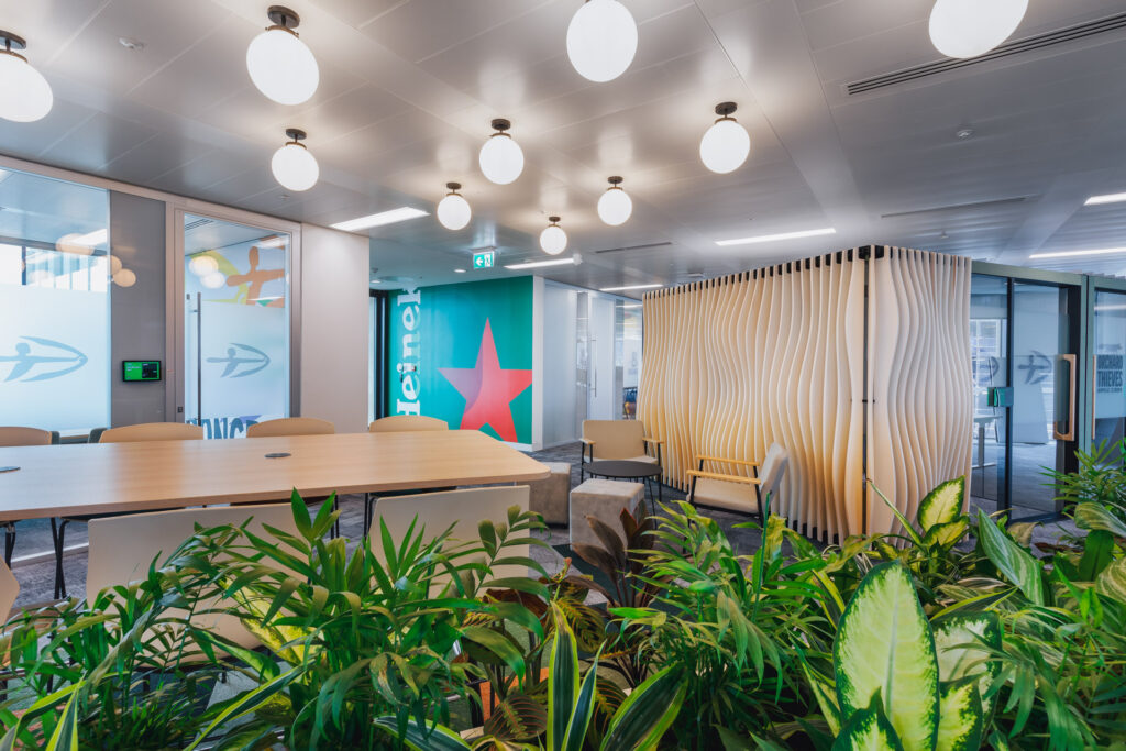 Sustainability was a big driver on the project from design through to final handover. The original architectural structure, partitioning, and carpets were all reused from the previous fit-out and the selection of all new furniture and finishes were made with sustainability in mind. Furniture reuse for the space was very high, with much of it being sourced either from Heineken’s previous office or from the former tenants of the space, reducing waste and extending product lifecycles.