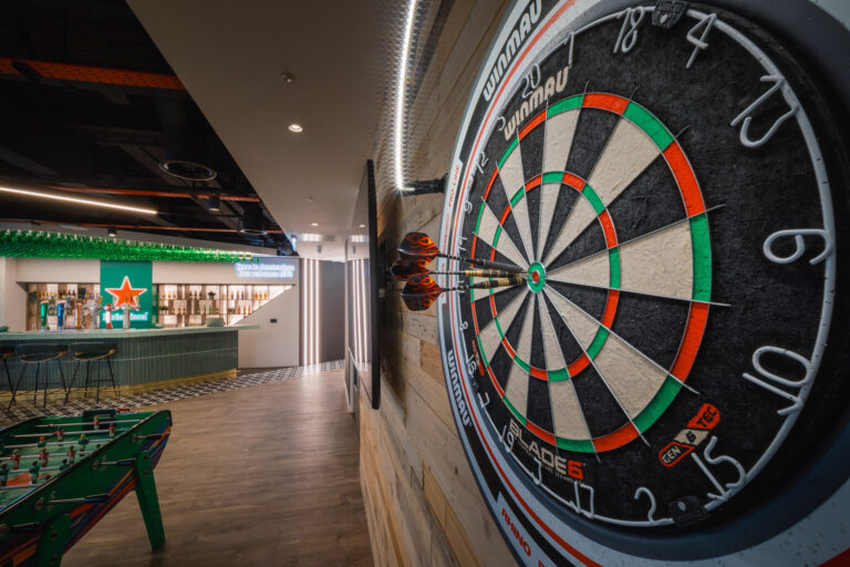 The standout feature of the design is the social area, complete with a fully functioning bar inspired by the Amsterdam head office. Featuring thousands of Heineken beer bottles hanging from the ceiling and all of their much-loved beers available on draught, the bar is the perfect place for their team to unwind together by enjoying a drink, and having a game of foosball or darts.