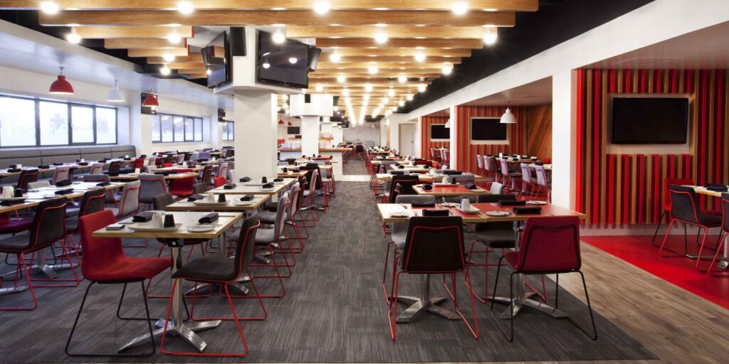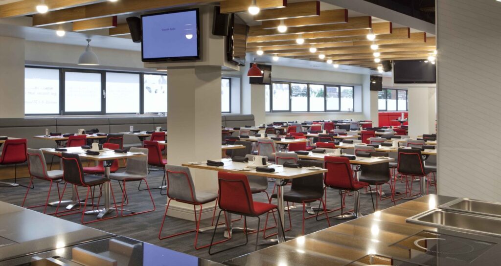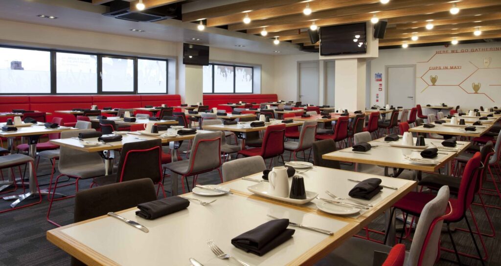 The refurbished lounges have a host of bespoke features that evoke the unique energy and vibrancy of Liverpool Football Club’s culture and story. The digital wallcoverings feature specially commissioned artwork that references key moments in the club’s history, quotes from its most colourful characters and commentary from some of its most memorable matches. These touches are complemented by ceiling rafts with wood beams to bring a warmth to the space, while the catering units and banquet seating provide the comfort and facilities to ensure the high standard of hospitality the club aims to deliver.