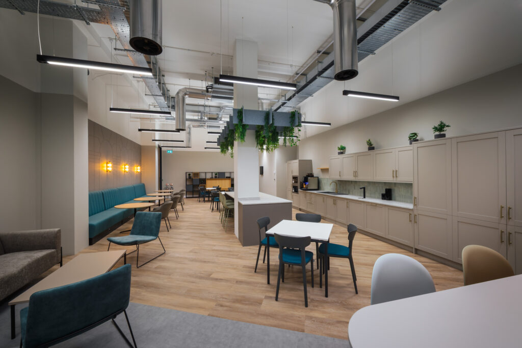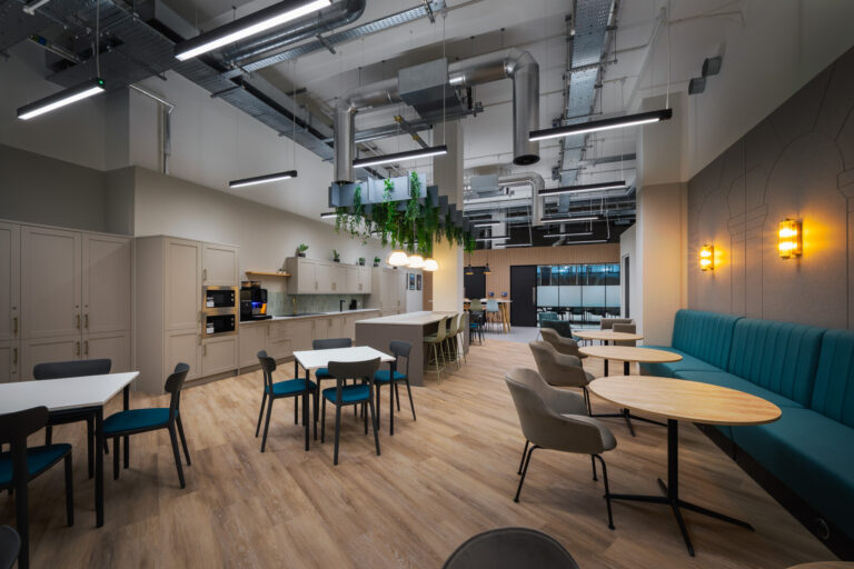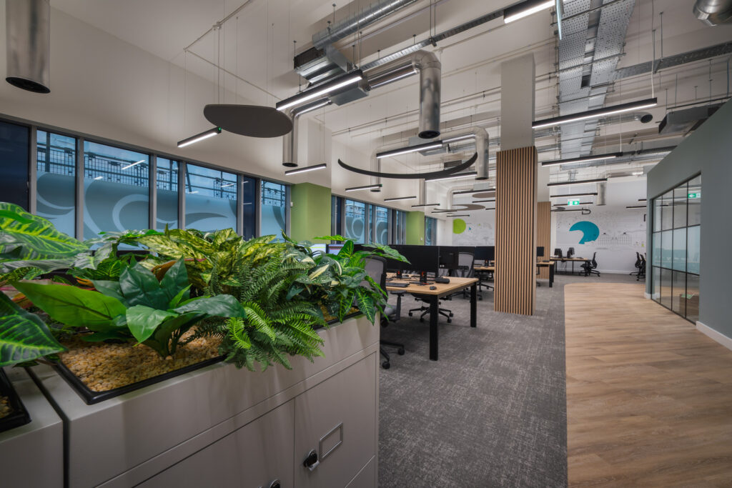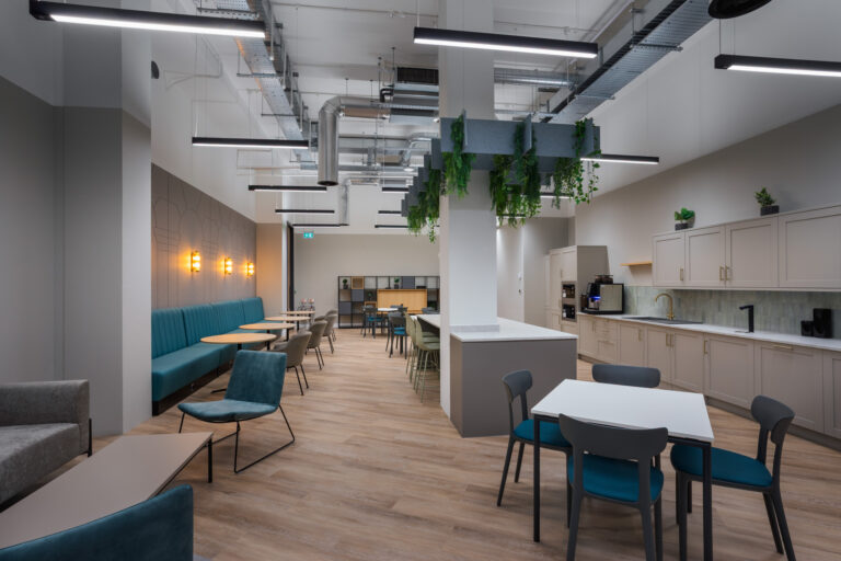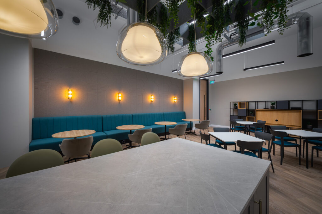 On the right-hand side, the space opens into a bright, inviting breakout area designed to feel both homely and warm. Acoustic panelling inspired by the arches of St Philip’s Cathedral softens noise throughout, creating a comfortable atmosphere for conversation and focused work. Biophilic elements introduce natural texture and greenery, supporting everyday interaction, informal collaboration, and social events.