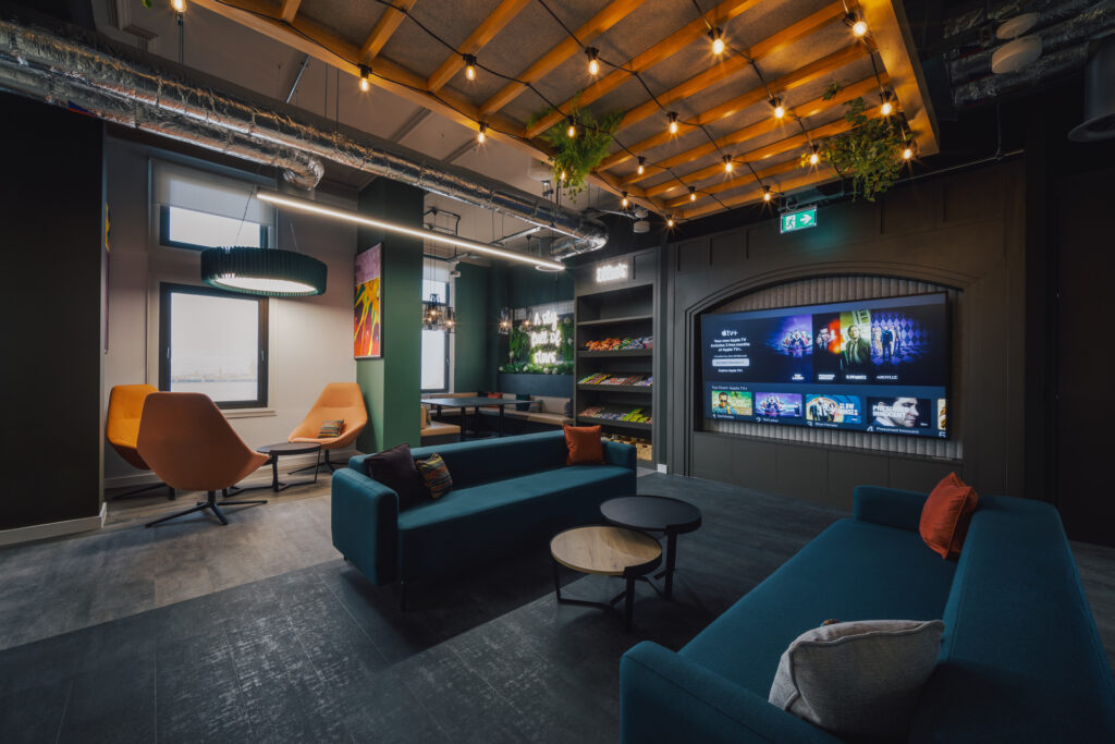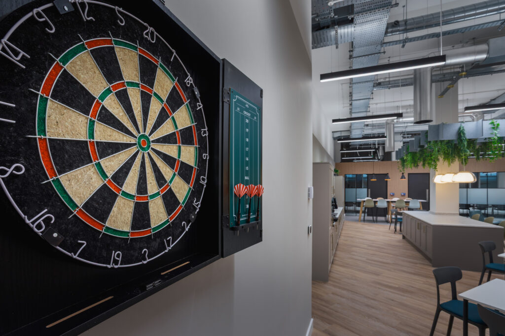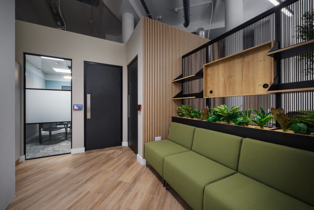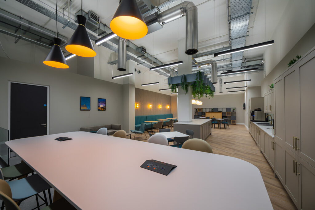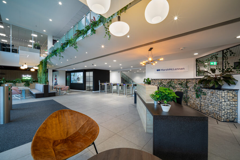 On the right-hand side, the space opens into a bright, inviting breakout area designed to feel both homely and warm. Acoustic panelling inspired by the arches of St Philip’s Cathedral softens noise throughout, creating a comfortable atmosphere for conversation and focused work. Biophilic elements introduce natural texture and greenery, supporting everyday interaction, informal collaboration, and social events.