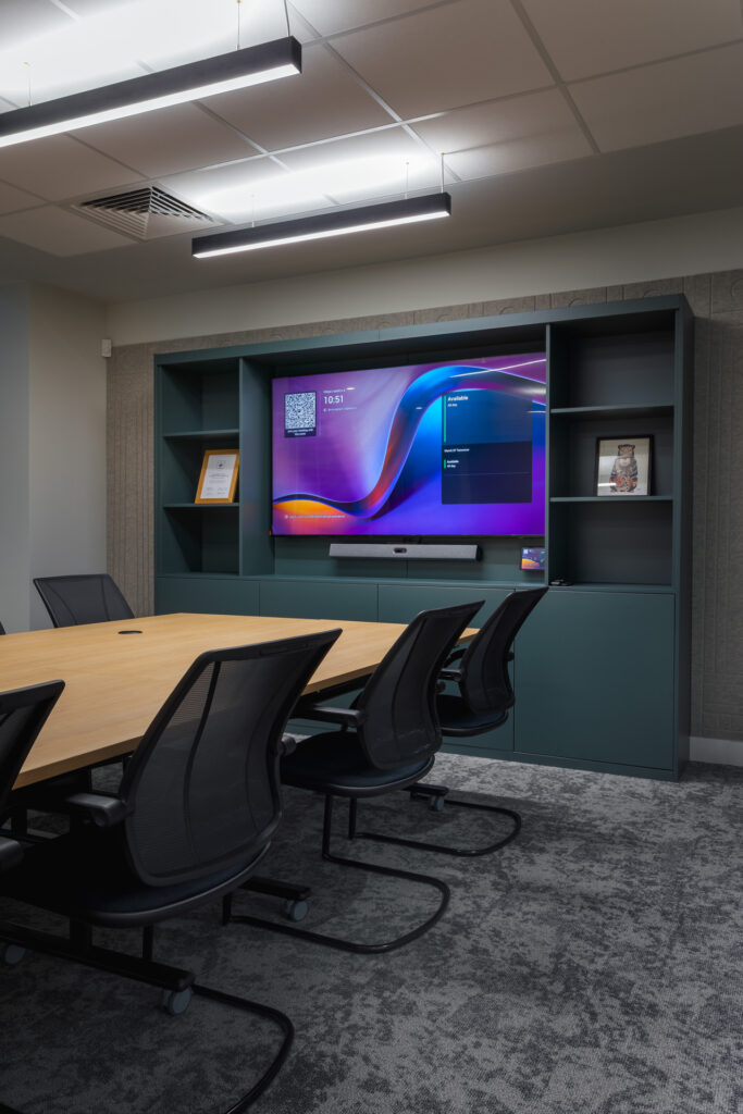 Sustainability played a key role in the project, reflecting MHA’s ambition to mirror the BREEAM Excellent standard of 35 Newhall Street within the interior design. Responsible choices guided the approach, from reusing existing task chairs to specifying carpet tiles made from fully recycled materials and integrating technology that supports carbon reduction through smarter lighting and heating. Working with a local supply chain further reduced environmental impact, ensuring the workplace is both environmentally conscious and aligned with long‑term responsibility.