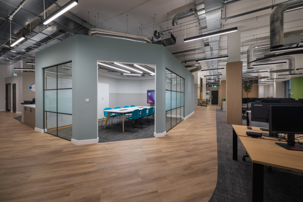 Two meeting rooms sit alongside a semi‑enclosed collaboration area defined by glazing and acoustic treatments, maintaining a connection with the wider floor while offering a degree of privacy.