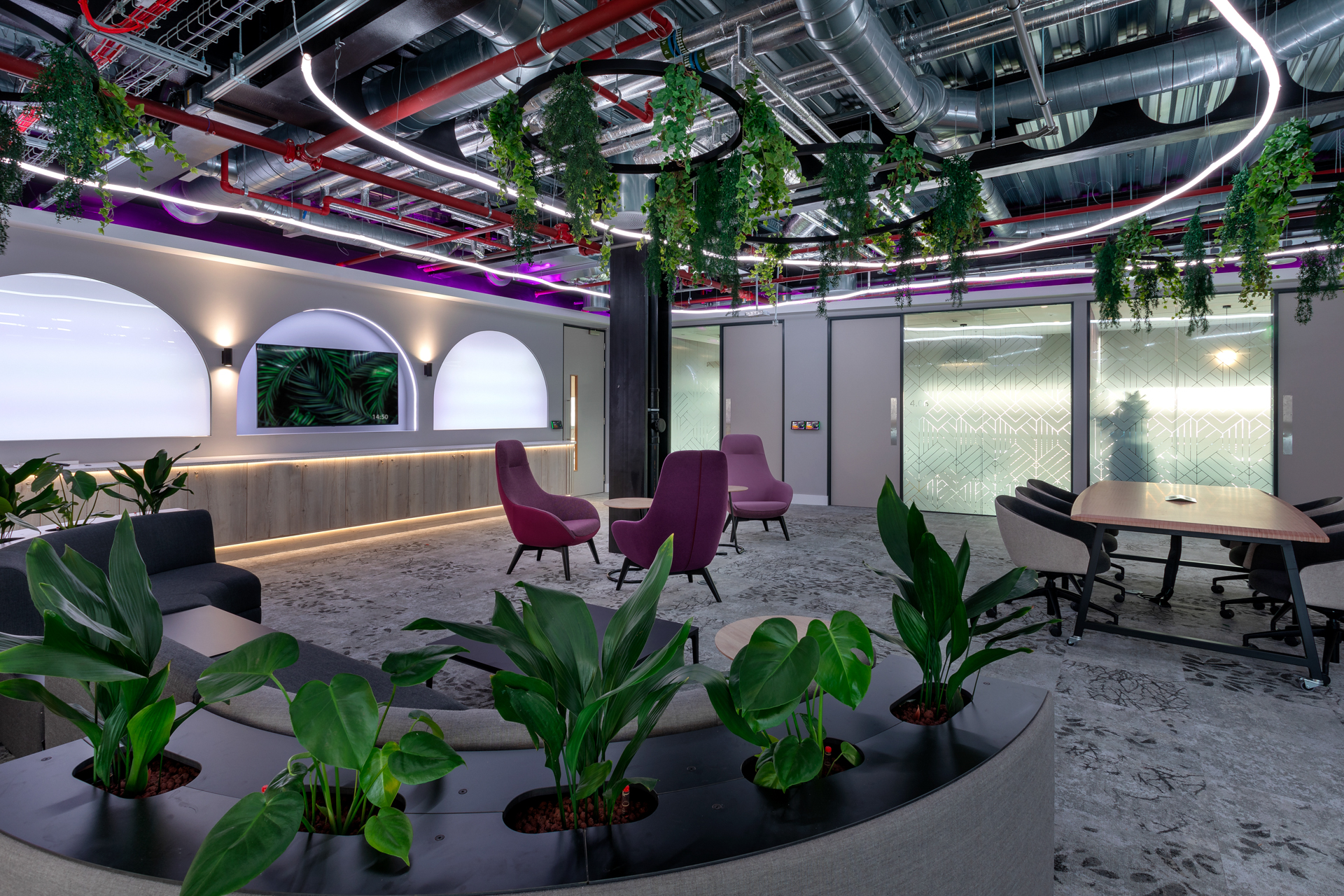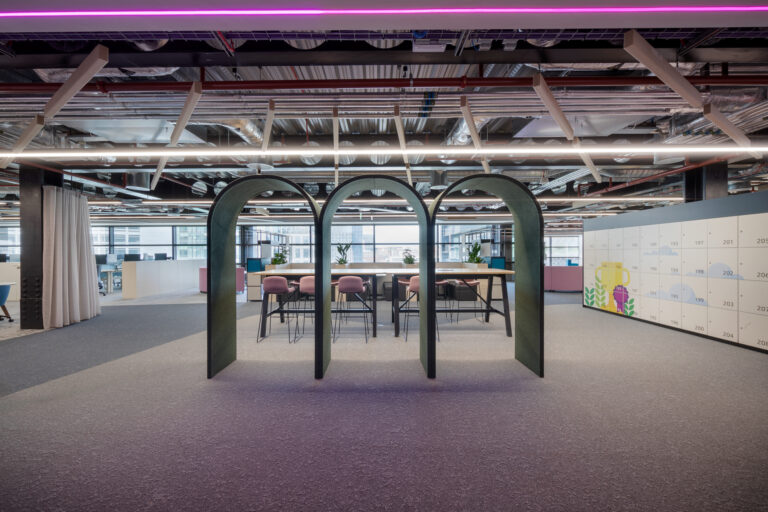 The design pulls in Birmingham’s character, including the library’s iconic pattern on acoustic panels, maximising the fifth-floor views, and adding architectural curves to bring the city’s style indoors. Organic arches and curved lines flow through the office – on floors, furniture, and meeting spaces – creating soft zones across the open layout. The furniture is all about flexibility: it’s easy to rearrange as the firm grows.