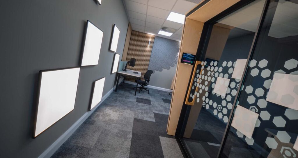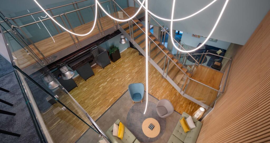 After exploring various buildings and overcoming challenges arising from high demand within Nottingham city centre, the team identified Chapel Quarter as the optimal location. With an understanding of the primary objectives for the new space following the successful Workplace Consultancy project, Claremont created a welcoming ground-floor reception, a variety of meeting rooms, configuration accommodating over 87 workstations, collaborative spaces, a kitchen, and shower facilities. The architectural challenge of the multi-level, unconventional structure with limited natural light was met by optimising window utilisation and implementing an intricate lighting scheme, including a striking atrium installation known as the “jungle light,” fashioned from LED rope lights.
