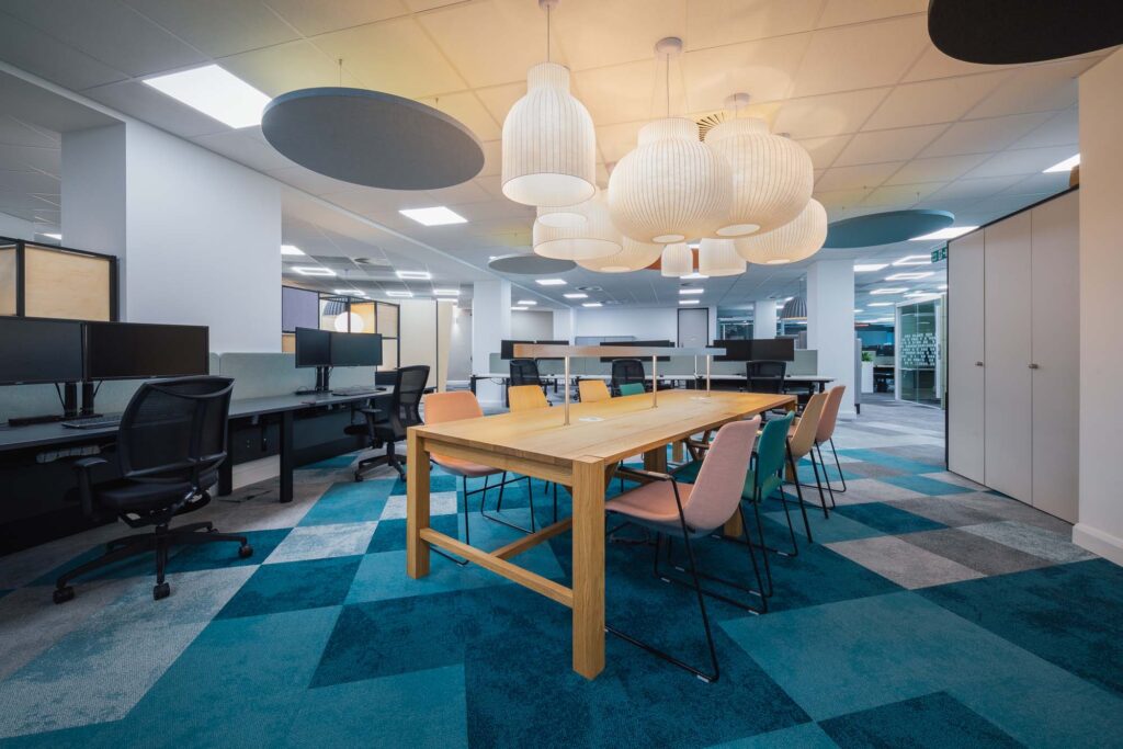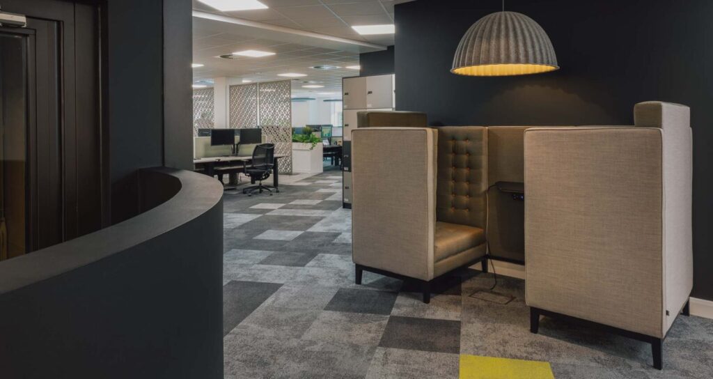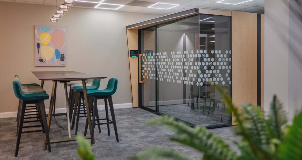 The result shows a dynamic and adaptable workspace that has successfully transformed into a Destination Office, enticing employees to embrace a return to the office and explore diverse work settings. The layout features both bookable desks and pods on the working floor, fostering an environment that empowers staff to manage space usage effectively. Through placement of pods and acoustic screens, a journey is created, ensuring a sense of privacy and comfort as individuals transition from an environment with separate offices to open collaboration. The collaborative areas are thoughtfully designed, offering a range of options from pods to project tables, booths, and soft seating. A muted, welcoming ambiance is cultivated by employing a soft colour palette, incorporating existing furniture, and utilising branded elements to establish a connection between different office locations, the project not only met but exceeded the acoustic and lighting challenges, resulting in a biophilic-infused, vibrant, and functional workspace.