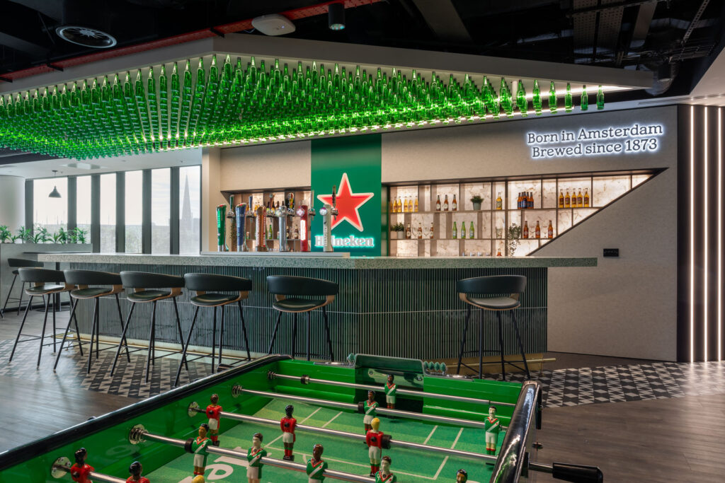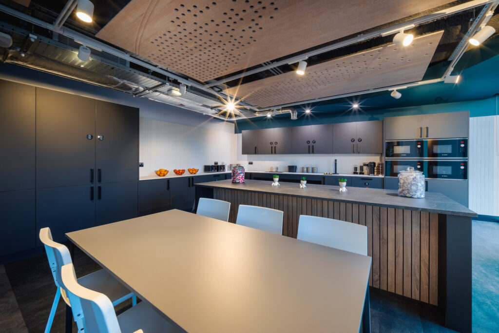 The breakout space draws inspiration from Dublin’s Icon Factory and Icon Walk, blending the city’s vibrant popular culture with its rich industrial heritage while maintaining Softcat’s distinctive brand and colours throughout. The area is the perfect space for the Softcat team to take a break from their desks, featuring a modern kitchen, a dedicated games area, soft seating, and a pool table, complemented by stunning views of the river and city. Artwork celebrating Dublin’s legendary musicians adds a creative touch, making the space both functional and culturally immersive.