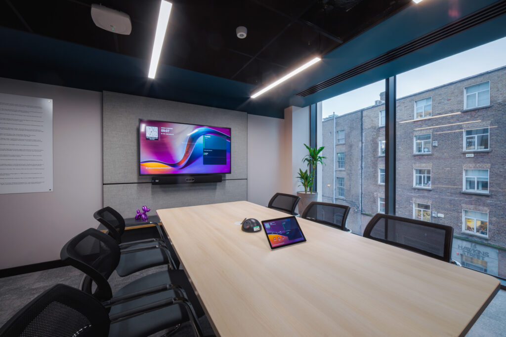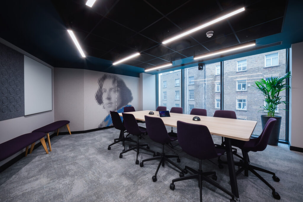 The main workspace is designed for flexibility and energy. It’s an open-plan environment that offers a mix of work settings to suit every need: touchdown tables for quick collaboration, soundproof pods for confidential calls, and a series of meeting rooms. There’s also a quiet area for those who need a calm space to focus. The meeting rooms help create a strong sense of local identity, tying the space to Dublin’s rich heritage. Each room is named after an iconic figure from the city – Arthur Guinness, Molly Malone, Oscar Wilde, Luke Kelly, and Samuel Beckett. Their presence is felt within the rooms too, with portraits brought to life through striking dot-pixel artwork, adding a distinctive and creative touch to the environment and helping the team feel at home.