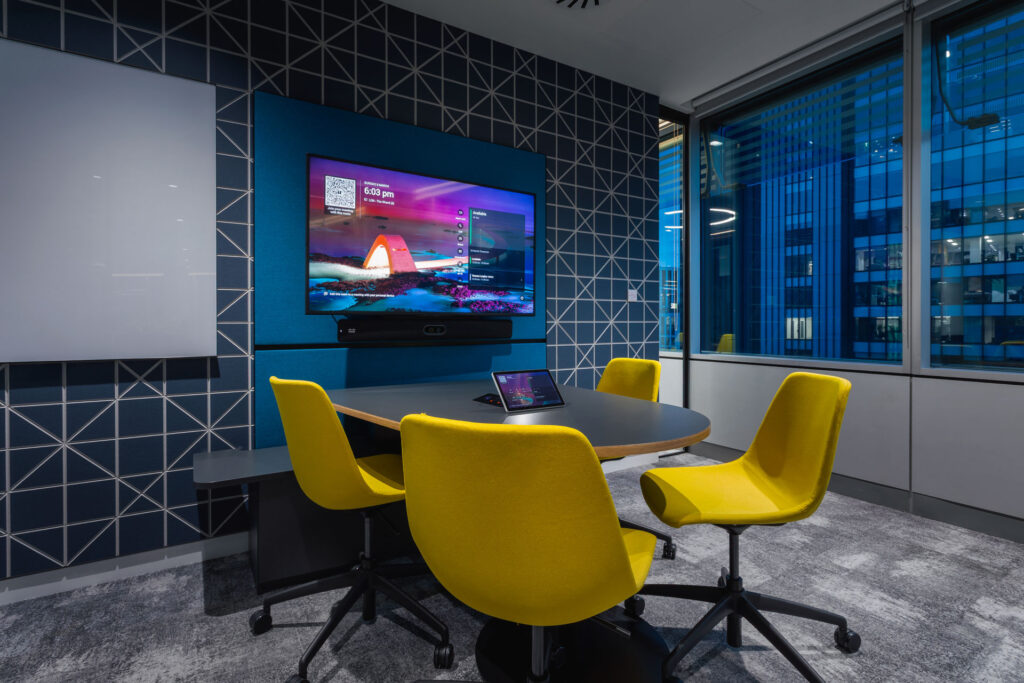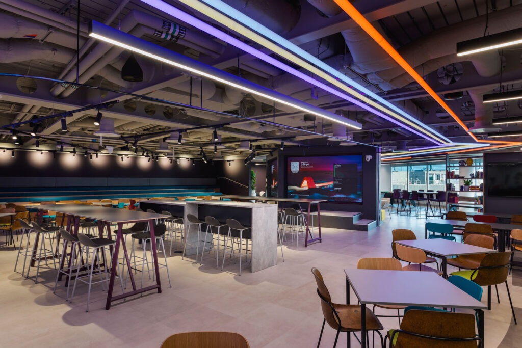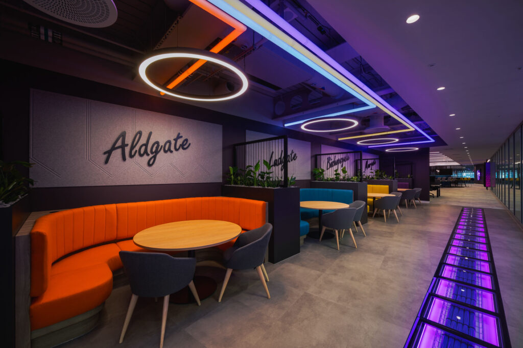 The design pays homage to London through subtle nods. A number of booths incorporate elements of The Seven Gates of London, LED lighting throughout the space is inspired by London Underground, while ceramic tiled walls make reference to the patterned designs found across Tube stations, reimagined in Softcat’s image.