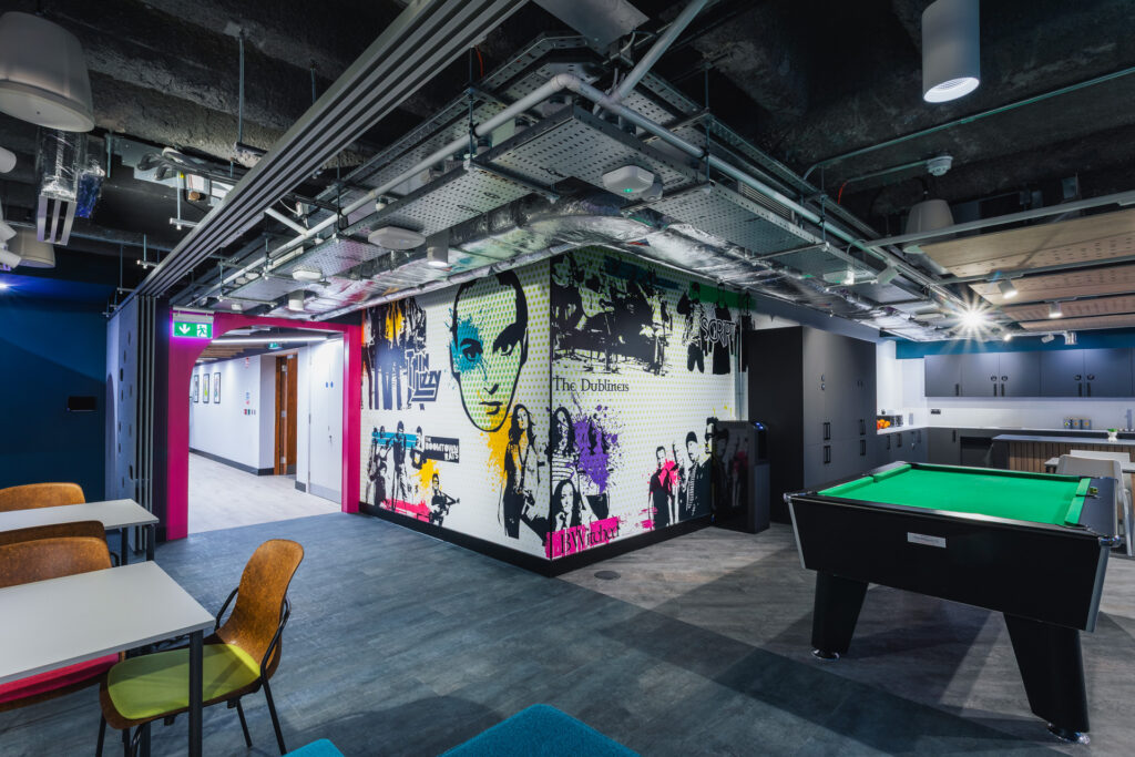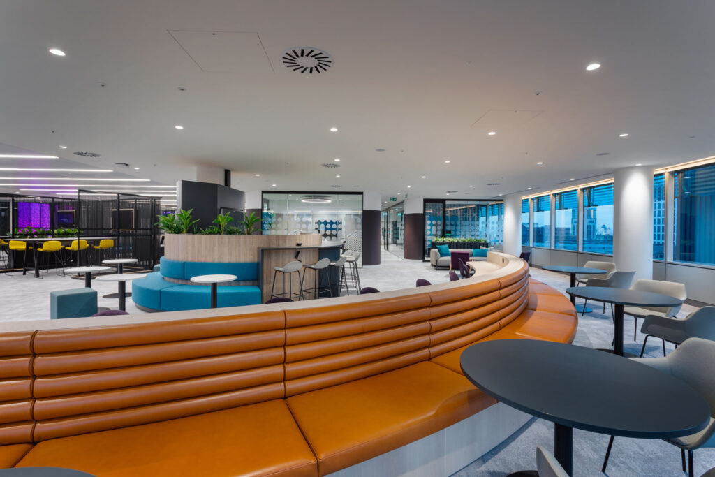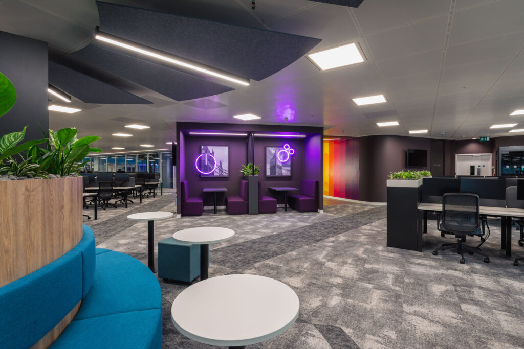 DIBE (Diversity, Inclusion, Belonging, Equity) principles laid the foundation for many of the design choices with wider walkways, recessed cabinets, and accessible booths ensuring everyone is accommodated for. As was the case with their Birmingham office, sustainability was also at the forefront of Softcat’s priorities. We’re proud to have delivered this project to a SKA Gold standard.