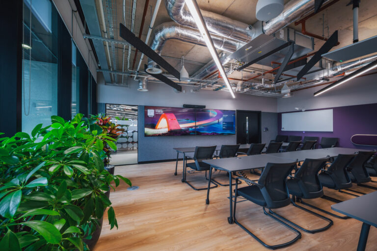 In line with Softcat’s brief, the space that supports both work and wellbeing. At its centre is a large breakout area that can be screened off from reception, perfect for town halls, social gatherings, and informal meetings. The implementation of the Academy North training centre supports professional development, while an access-controlled Northern Operation Centre complements their central hub in Marlow. A games lounge, set apart from the open-plan area, gives employees a chance to step away from their desks and unwind.