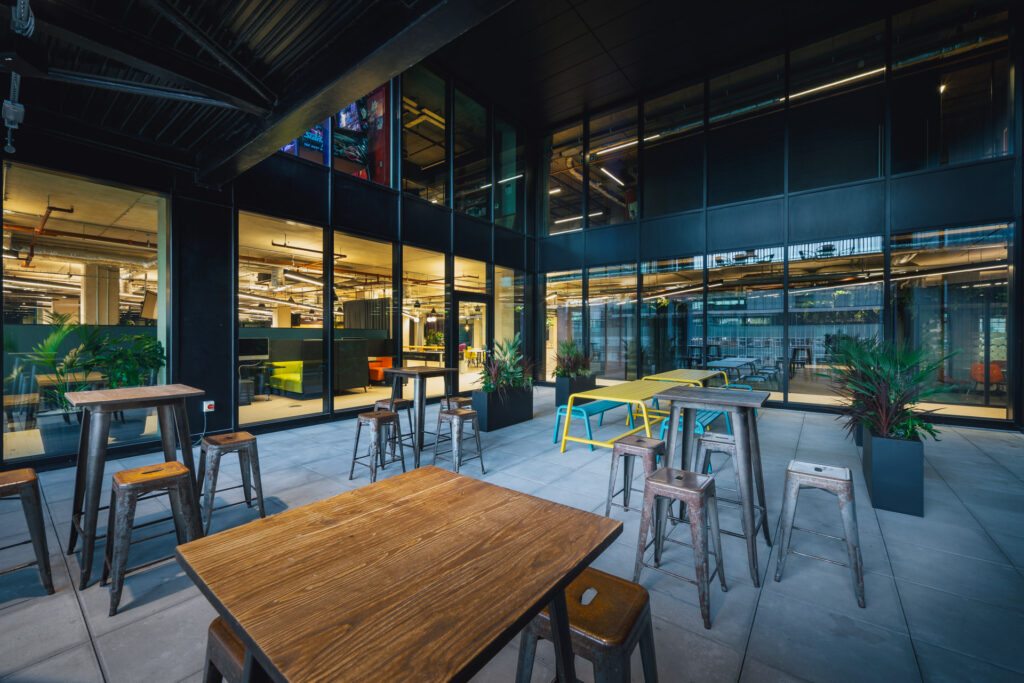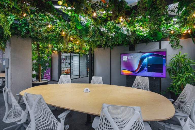 Throughout the office, biophilic design introduces warmth and tranquillity, with planting used to soften the environment and support individuals with neurodiverse needs. A standout example of this is the Oasis Secret Garden – a Manchester-inspired social space, discreetly tucked away behind layered partitioning and glazing, visible only from close proximity. It serves as the perfect setting for small vendor stalls, intimate training sessions, or as a versatile space for entertainment and hosting.