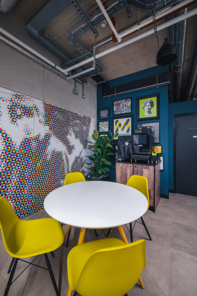 The space is a celebration of Manchester as much as it is a celebration of Softcat. Design elements throughout the office pay homage to the city, highlighting its history, culture, and people through artwork and meeting room names. References to the Manchester Bee, the tram network, Oasis, and various city regions can be found throughout, alongside many other nods to the city’s cultural identity.