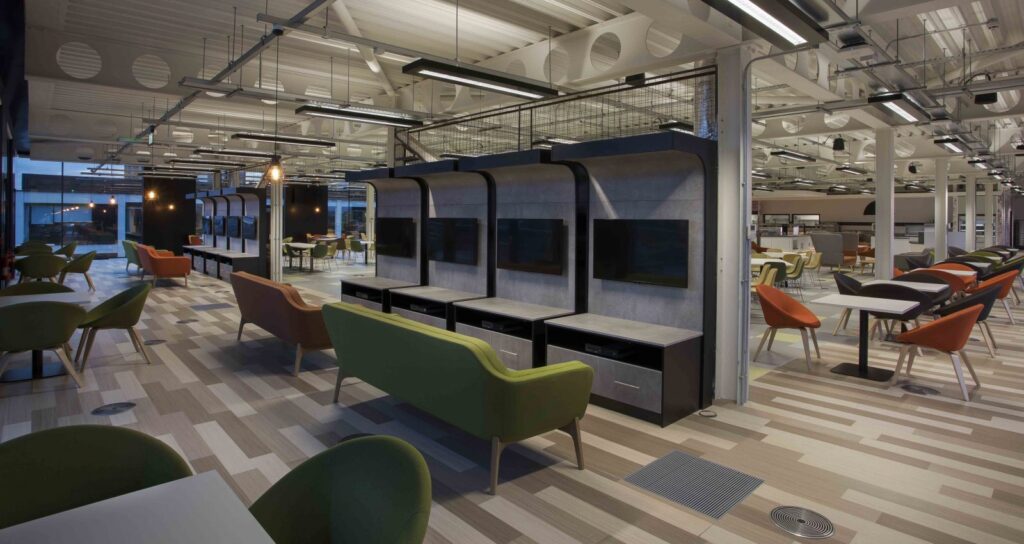 Technology is integrated throughout, with tablet-integrated furniture and mobile digital screens on the main floor plates as well as video-conferencing and other collaboration technologies within meeting rooms. TalkTalk’s central control room, which monitors the performance of its UK services network, is also located within the Salford office and comprises 2 areas called N.O.C and S.O.C supporting 52 working colleagues viewing a total of 35 multi feed display screens and a switchable ‘opaque to clear’ glass partition into the main office.