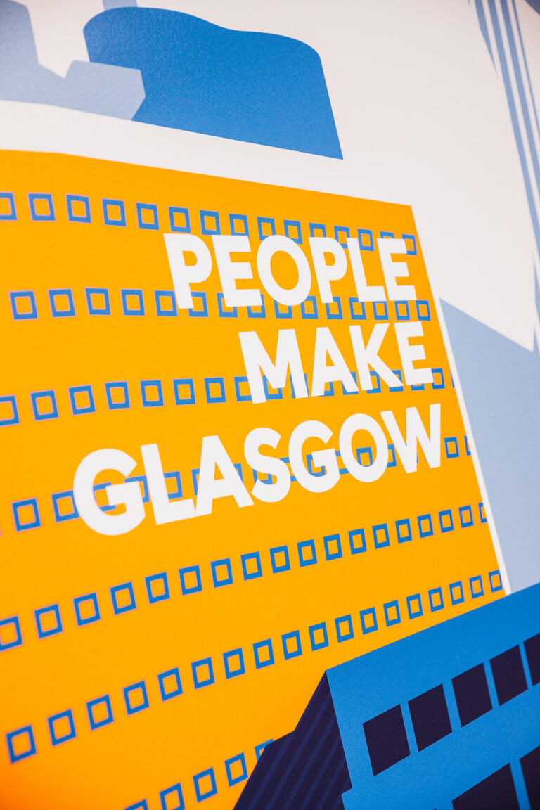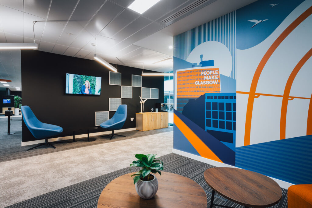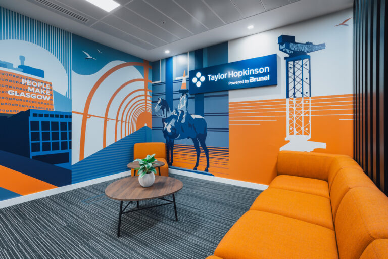 The design took inspiration from various sources. Inspired by the local people and culture, the design incorporates the iconography of Glasgow with references to the architecture, landmarks, and renowned Glaswegian artists. Meeting rooms throughout the space also take their names from famous Scots past and present. Through working closely with the Taylor Hopkinson marketing team, their brand is subtly weaved into the design through brand colours, graphics, and artwork, as well as nods to their renewable energy background such as solar panel acoustics.