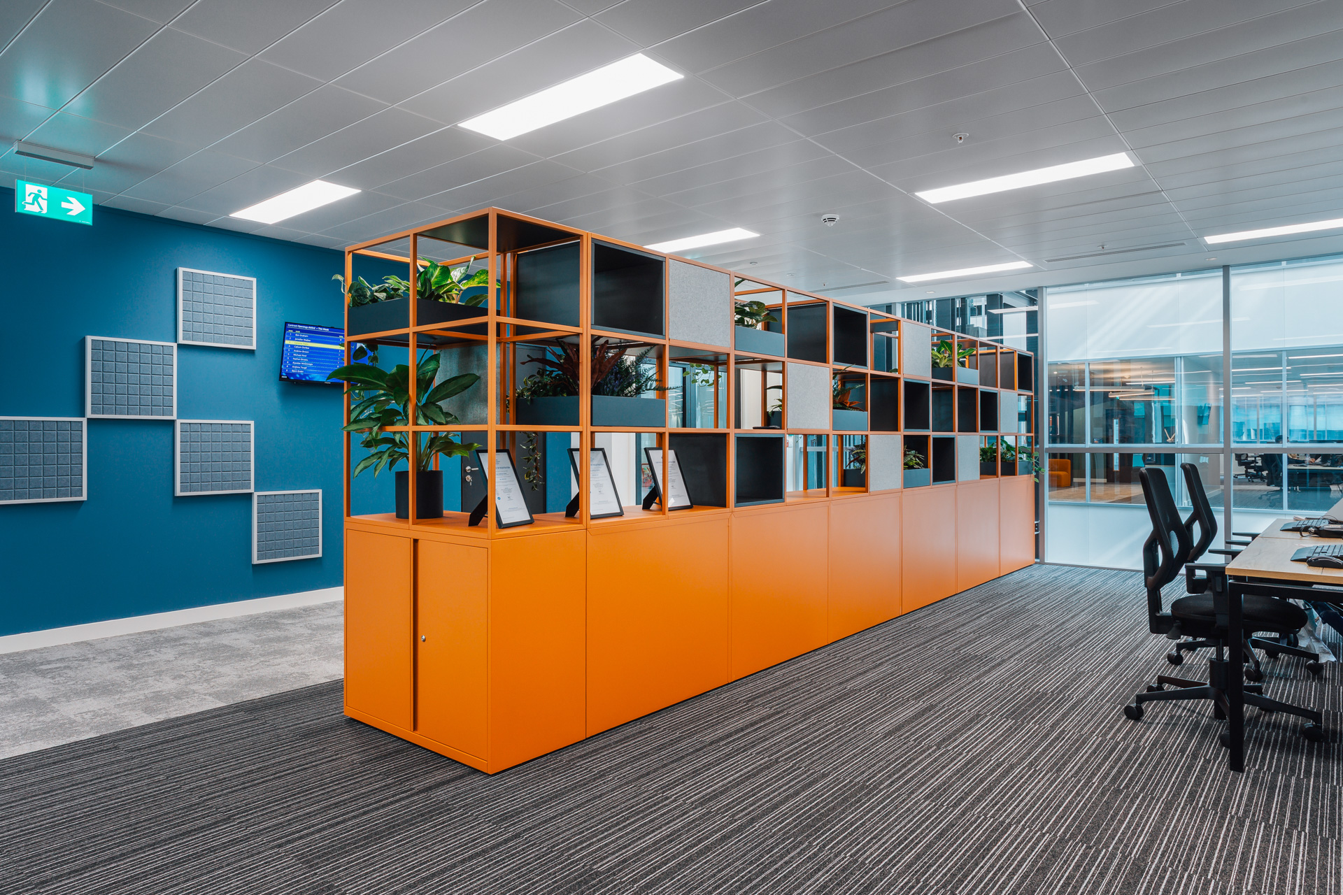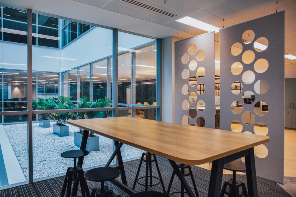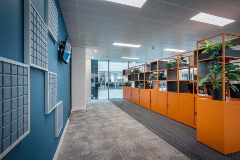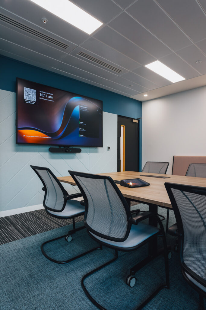 Diversity and inclusion have been thoughtfully integrated throughout the design. Wayfinding is intuitive, supported by clear signage and well-defined circulation routes, enhanced with feature flooring to make navigation around the office straightforward and stress-free. Acoustic rafts and screens provide gentle sound buffers within the open-plan layout, while desks are strategically positioned near natural light to promote comfort and productivity. A dedicated wellbeing and faith room is tucked into a quieter corner of the space, offering privacy and a welcoming environment for individuals to reflect or practice their faith in peace.