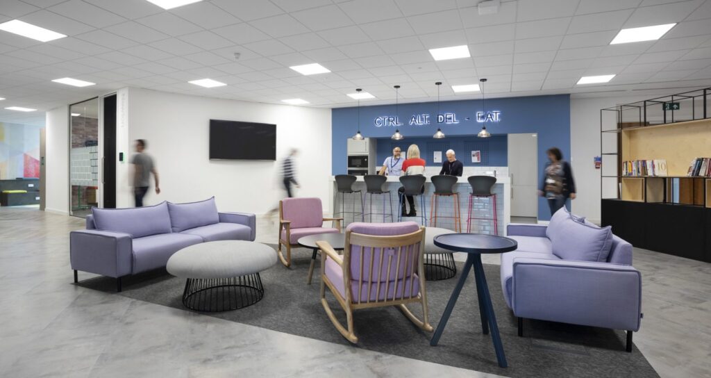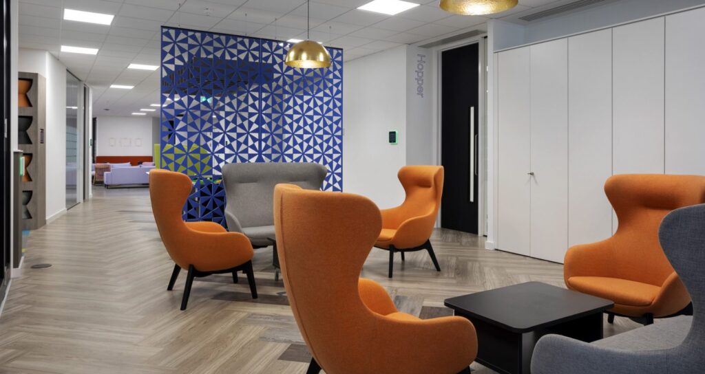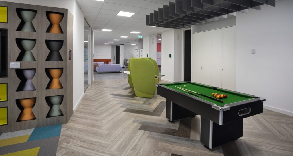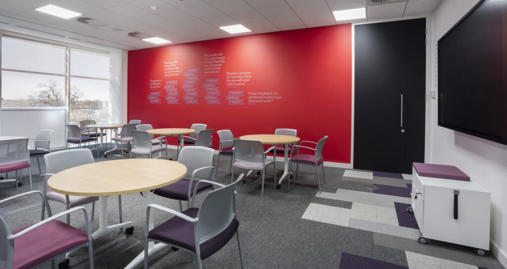 The finished space is contemporary, flexible and tech-ready and challenges the idea of a traditional training environment thanks to its strong focus on playfulness and bringing people together. The space includes one large breakout area which not only encourages teams to socialise but also acts as an inviting welcome area for all training activities.