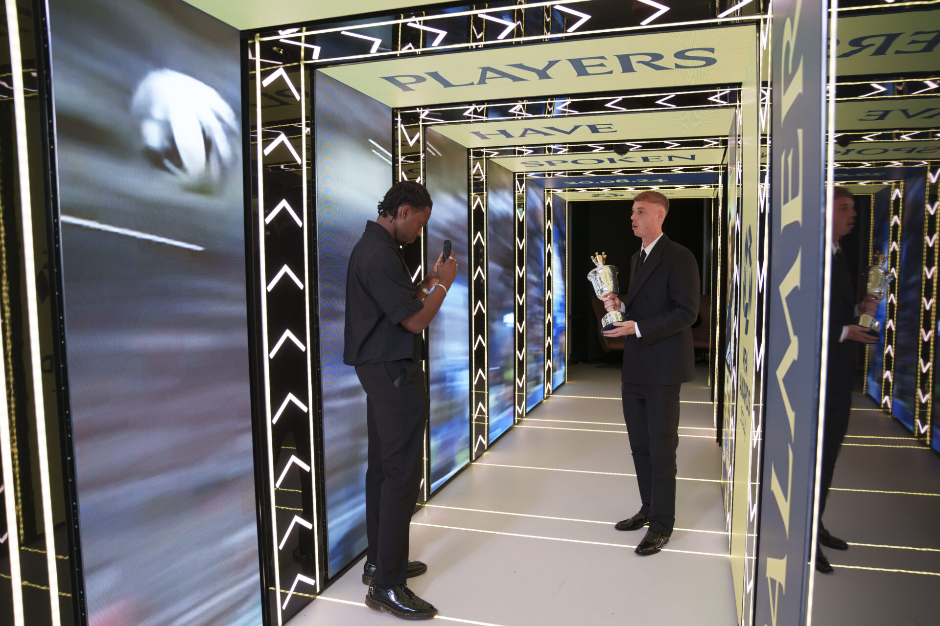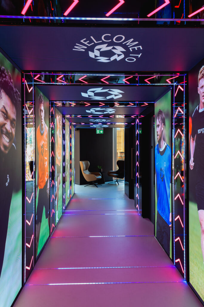 As you enter the welcome lounge, the logo is represented in football studs, but it’s the addition of an immersive video tunnel that delivers the biggest wow. Featuring player footage, floor-level lighting, and audio.