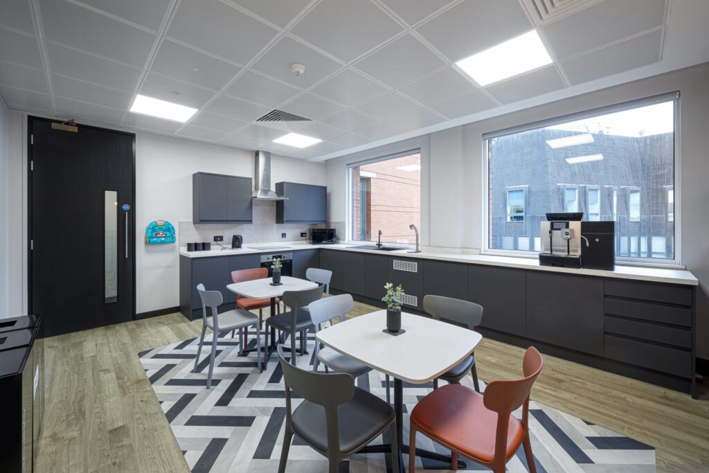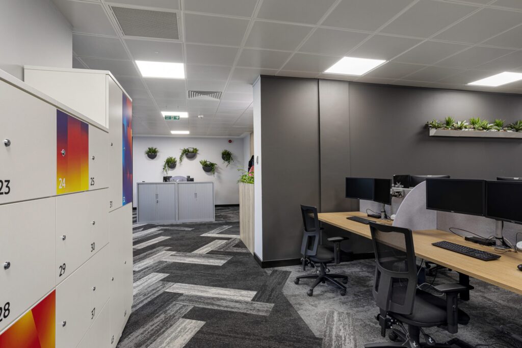Other design features include a refurbished home-from-home kitchen for lunch breaks and informal gatherings, the use of natural planting to add visual interest and support wellbeing, and strong brand storytelling with company values adorning the staff entrance walls and pops of the brand colours appearing throughout.
