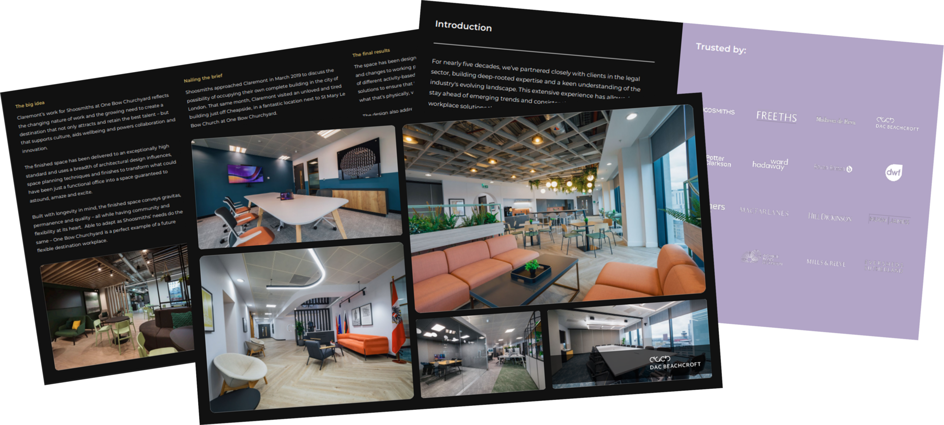 Explore our latest legal sector workplace portfolio, featuring a range of thoughtfully delivered projects for respected firms including Shoosmiths, DAC Beachcroft, Potter Clarkson, Mills & Reeve, and many others.