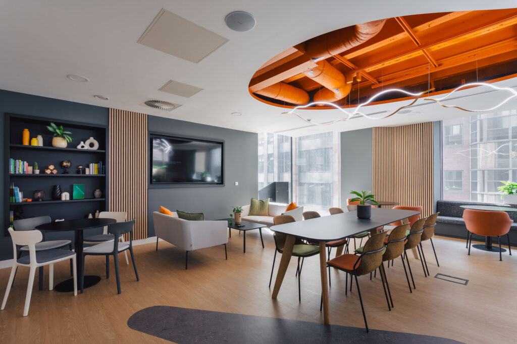 The design draws heavily on Glasgow’s culture and identity, while subtly referencing Taylor Hopkinson’s renewable focus through material choices and acoustic features inspired by solar panels. Sustainability and inclusion were central to the project, with extensive furniture reuse, SKA-led design decisions, intuitive wayfinding, and a dedicated wellbeing and faith space. The result is a future-flexible HQ that brings teams together and allows room for continued growth.
